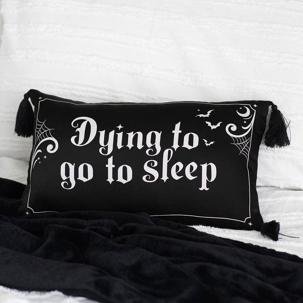Rest in gothic comfort with this polyester satin cushion featuring the playful slogan “Dying to Go to Sleep.” Perfect for adding a girly goth vibe to your sofa or bed, it’s a must-have for fans of edgy décor.