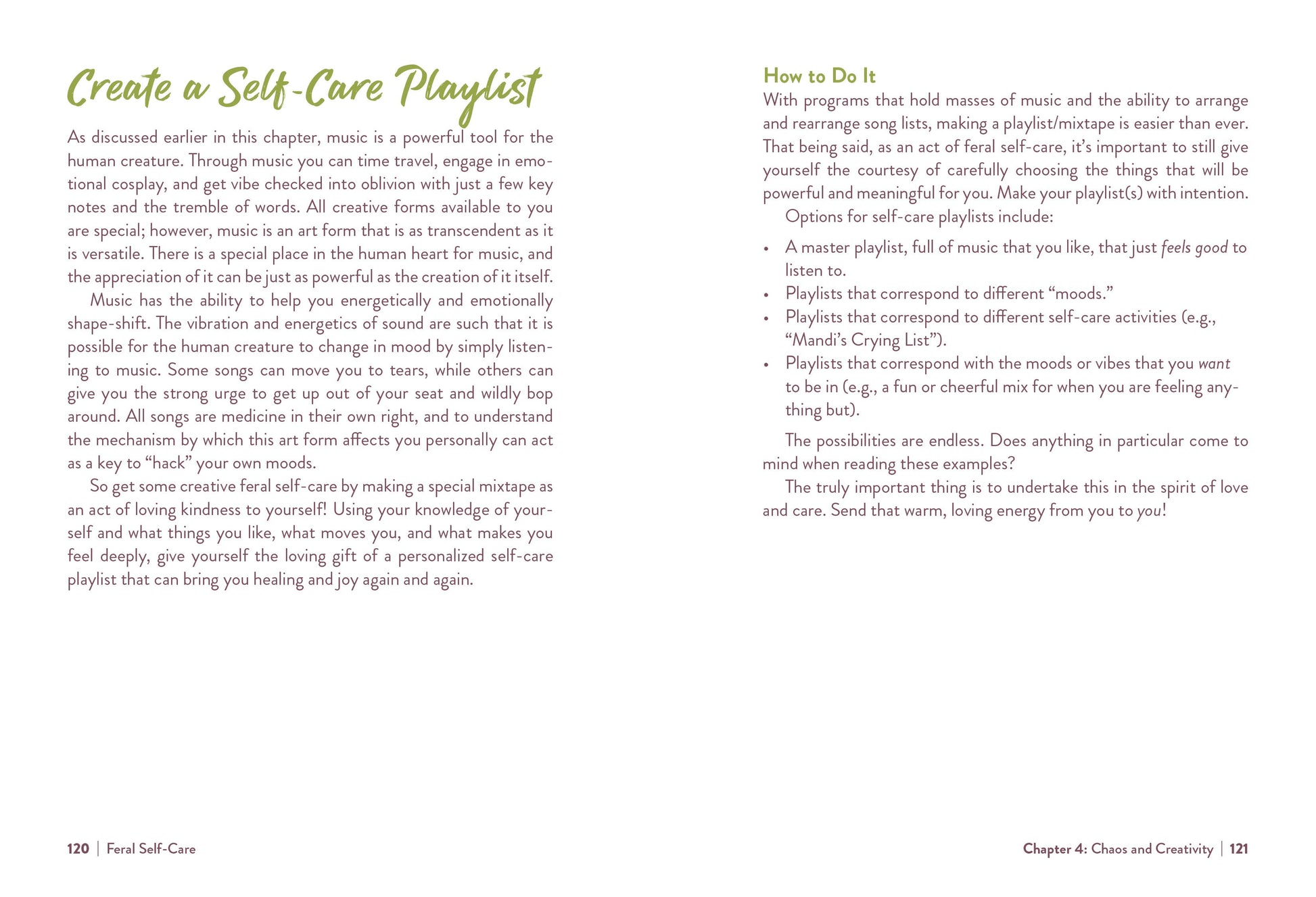 Feral Self-Care is loaded with self-care ideas that will actually help nourish your soul and make you feel good. Each entry covers an activity that reconnects you with your authentic self, helping you feel more empowered, free, and confident in embracing this human experience—in all its messy glory.