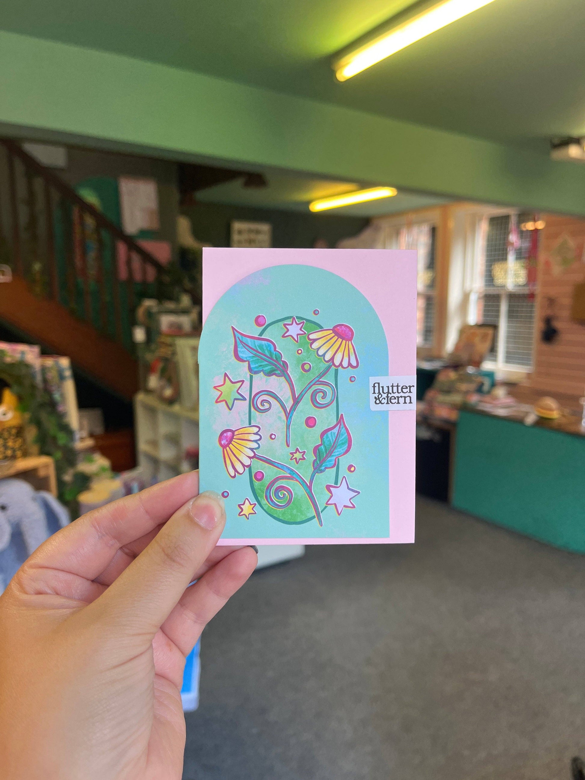 Summer vibes are in full bloom with our Floral Arch A7 Card. Get ready to embrace the warm weather with this playful card featuring a vibrant floral arch. Perfect for any occasion, spread some sunshine and send this unique card to your loved ones. No wilting flowers here! Key Features * A7 Greetings Card * Blank Inside * Printed on uncoated stock made from 100% genuine de-inked post consumer waste and FSC® certified. * 350gsm/450 microns * Matching Light Pink Envelope * Designed by Joanne Palmer