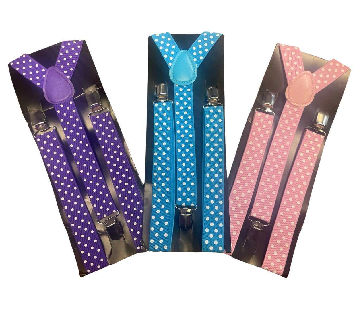 Adjustable stretch elastic braces with 3 silver tone clips.